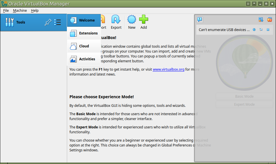 続いて、同じページから「VirtualBox Extension Pack」をダウンロードしてください。先程インストールしたVBoxを起動して、Toolsの右端をクリックして、「Extensions」に切り替えてください。後は、「Install」ボタンを押して、ダウンロードしたExtension Packのファイルを選択するだけです。