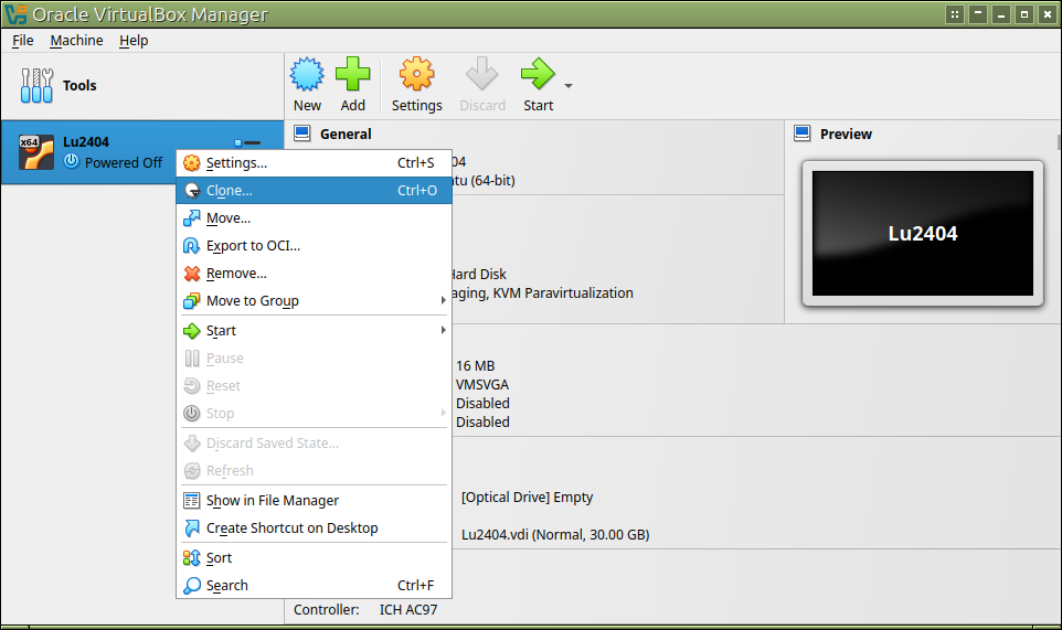 元のVMを停止してください。VMにマウスを持って行って右クリック、「Clone」を選んでください。