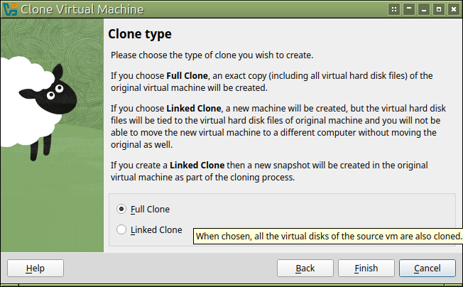 Linked CloneかFull Cloneかを選んで「Finish」でクローンが始まります。